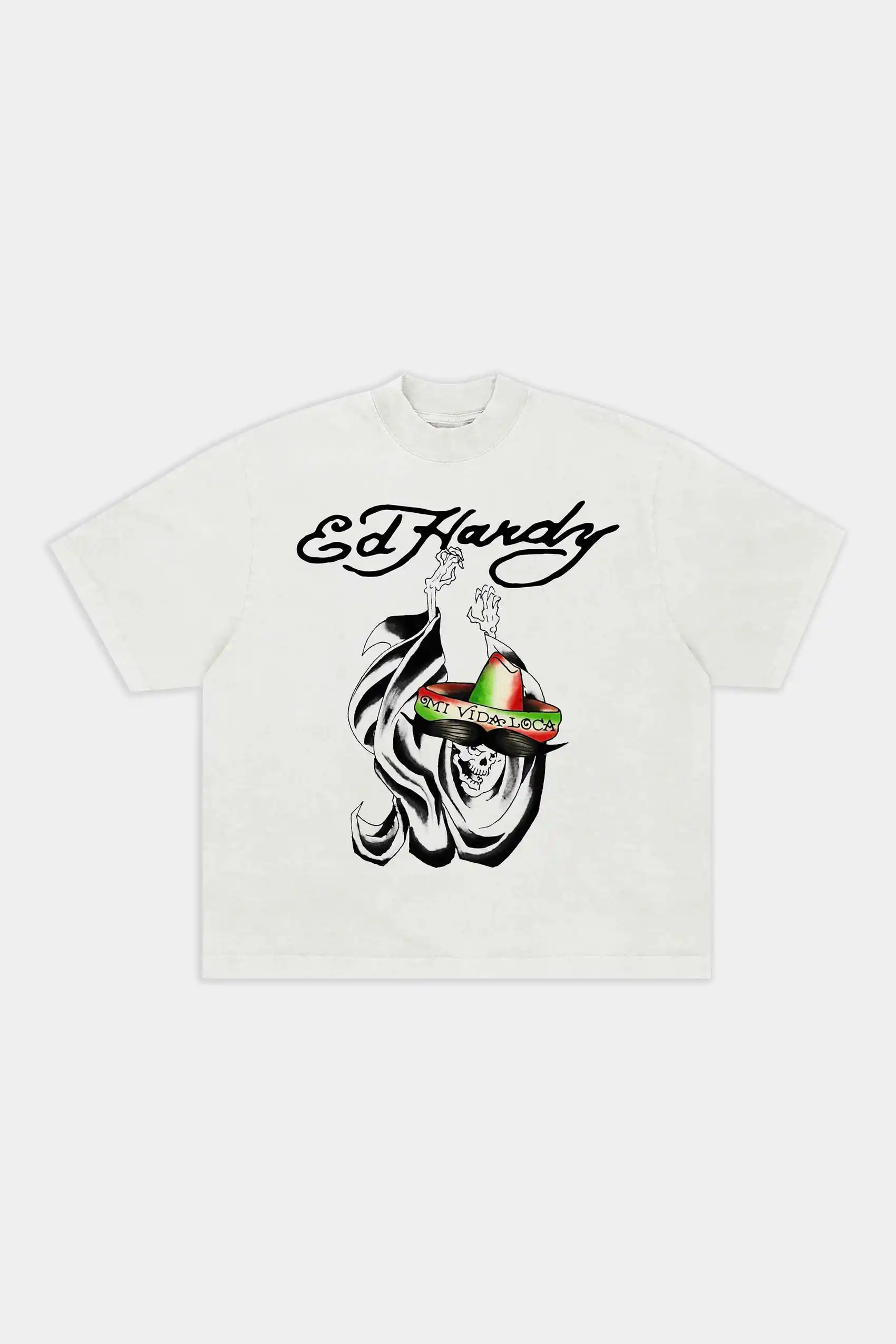 A Camiseta Ed Hardy Mi Vida Loca (White) é um clássico contemporâneo da coleção oficial Ed Hardy. Em malha 100% algodão, traz estampa frontal em silk com a icônica Morte de sombreiro mexicano, junto do logo Ed Hardy e a inscrição “Mi Vida Loca”. Uma camiseta que reforça a fusão entre tatuagem old school e identidade cultural marcante.