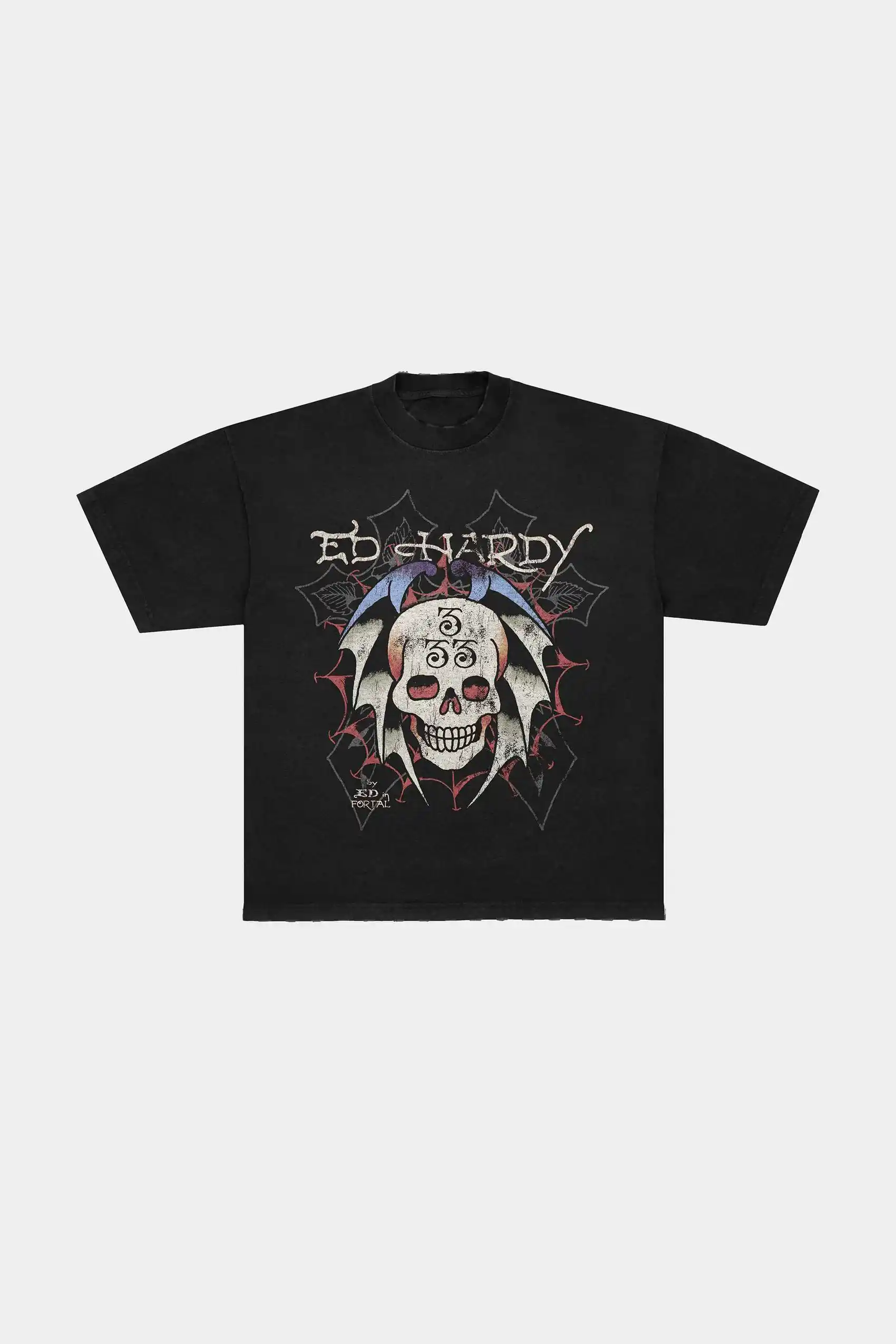 Confeccionada em malhão 100% algodão pré-encolhido, a peça apresenta estampa frontal em silk de uma caveira com asas de morcego, unindo a estética tattoo clássica da Ed Hardy com a identidade visual do Matuê.