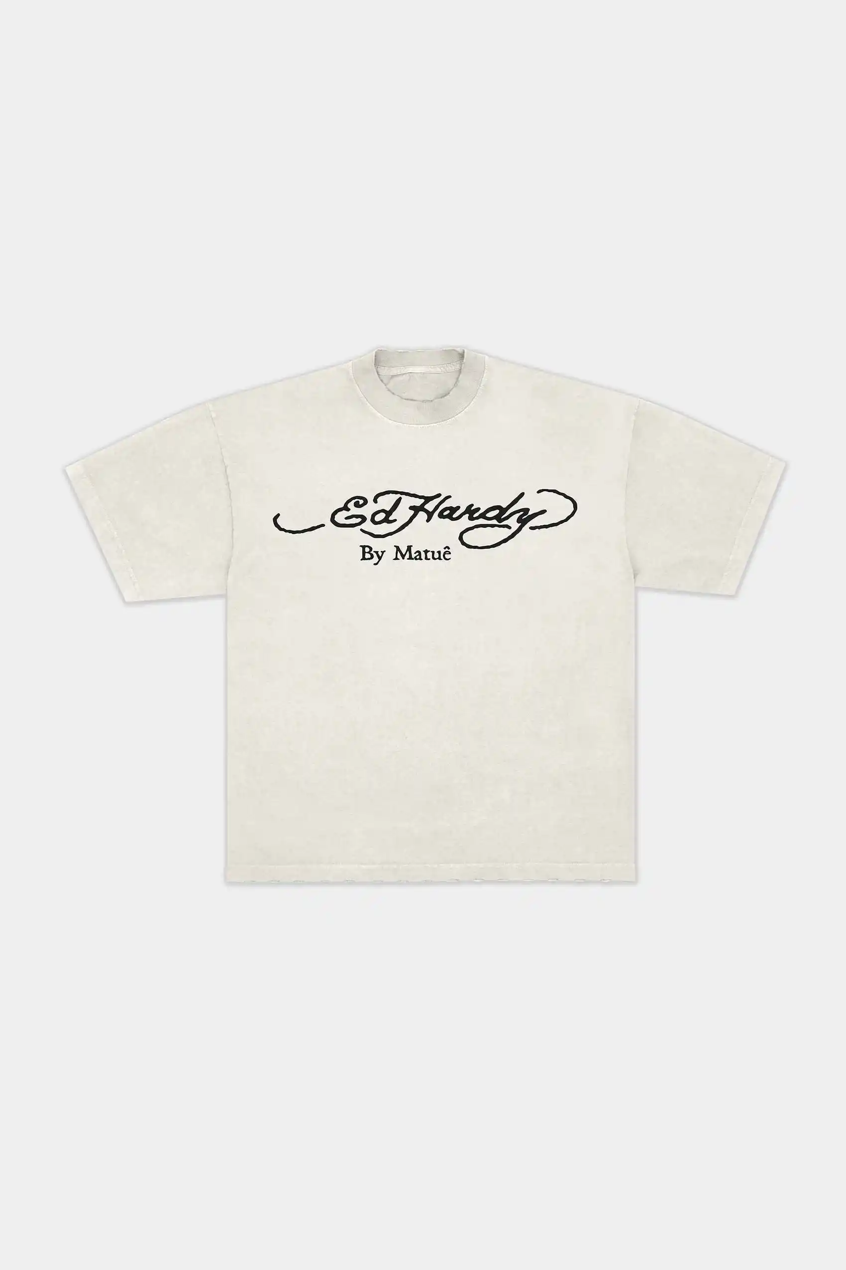 A Camiseta Ed Hardy x Matuê By Matuê (Off White) destaca a assinatura da collab em uma base clara, trazendo leveza visual sem perder identidade.