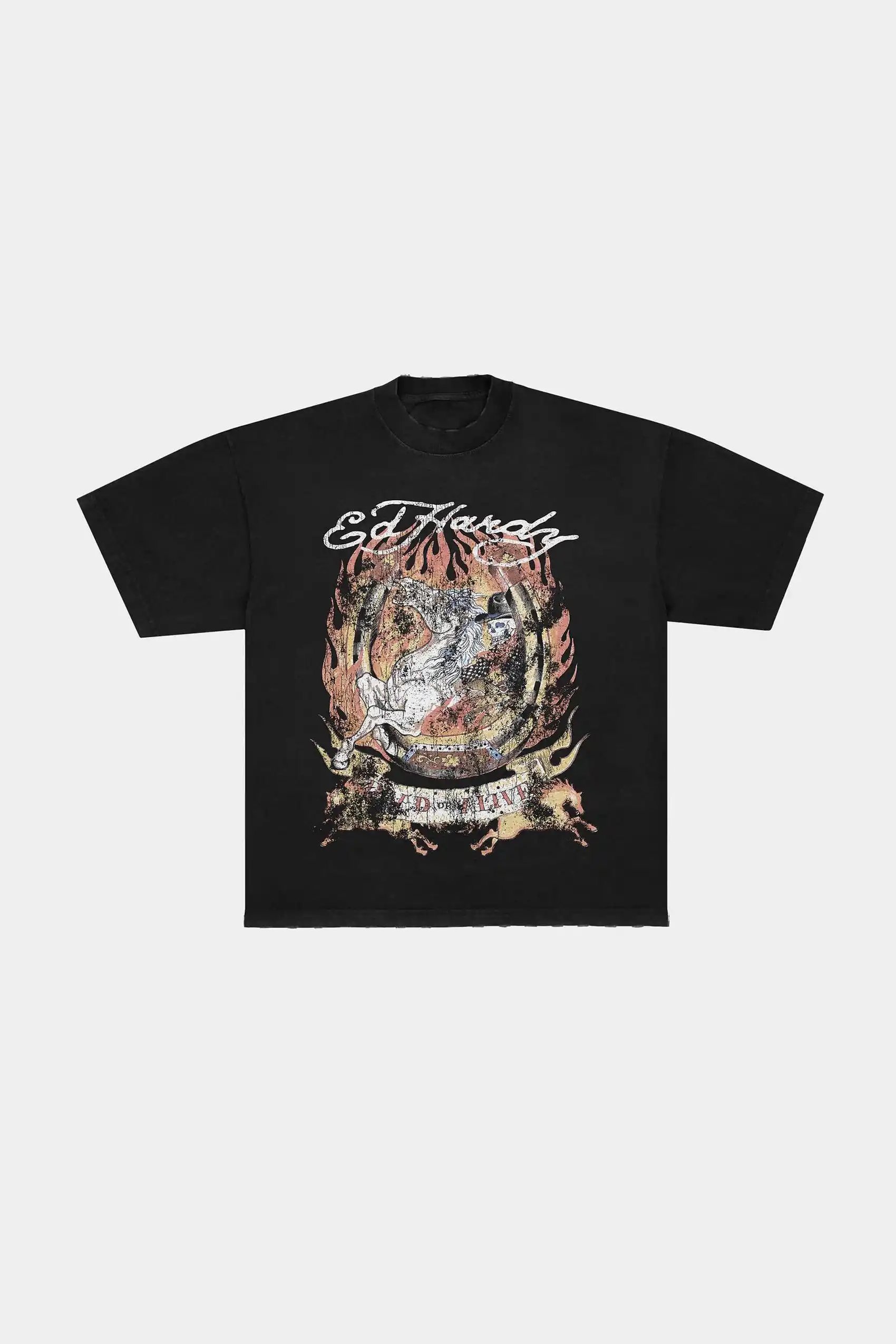 O gráfico traz um esqueleto montado em um cavalo envolto em chamas, acompanhado da frase “Dead Or Alive”, enquanto o logo Ed Hardy aparece acima da estampa, selando a identidade da collab. A base preta intensifica o contraste e o peso visual da peça.