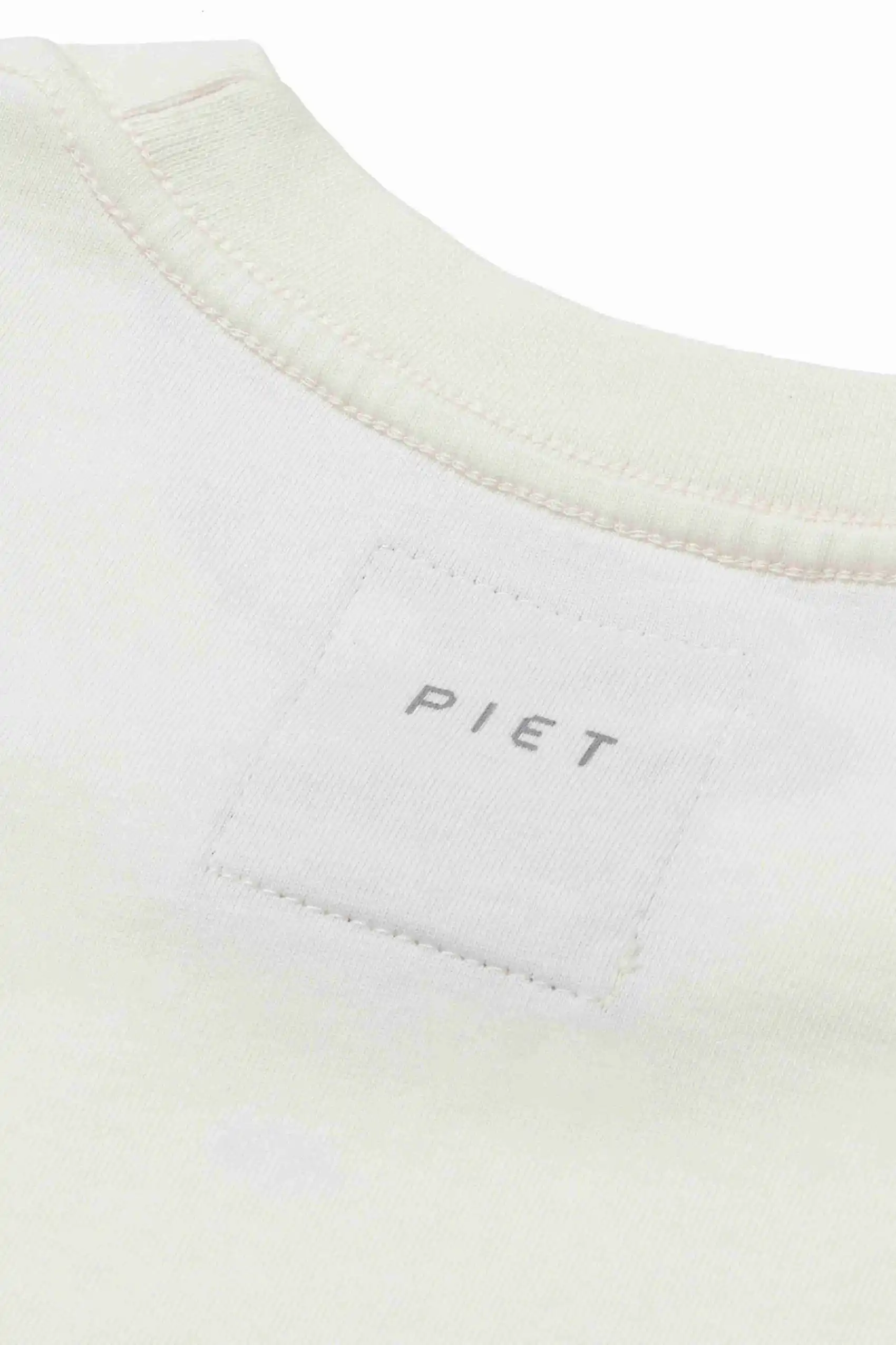 A modelagem relaxed, com ombros caídos e gola de 2,5 cm, reforça o visual clean e contemporâneo. Na parte frontal, a elipse com acabamento foil metálico suave adiciona identidade sem excesso. Na parte traseira, o pequeno logo PIET próximo à gola complementa o design.