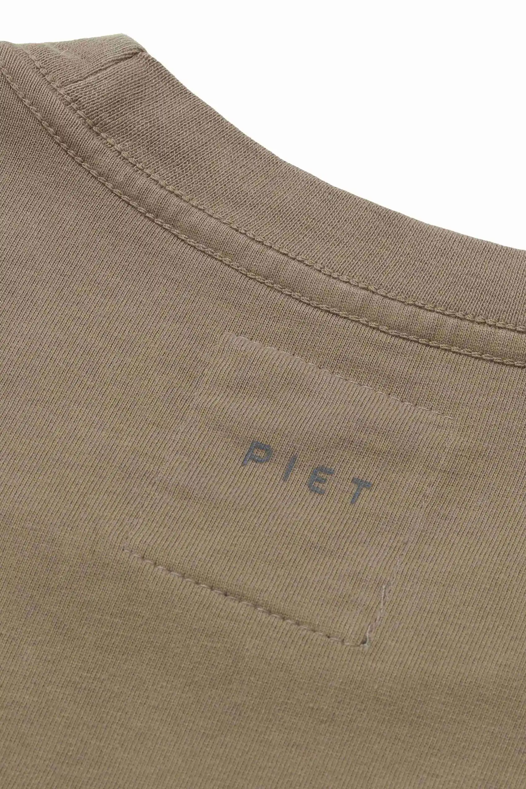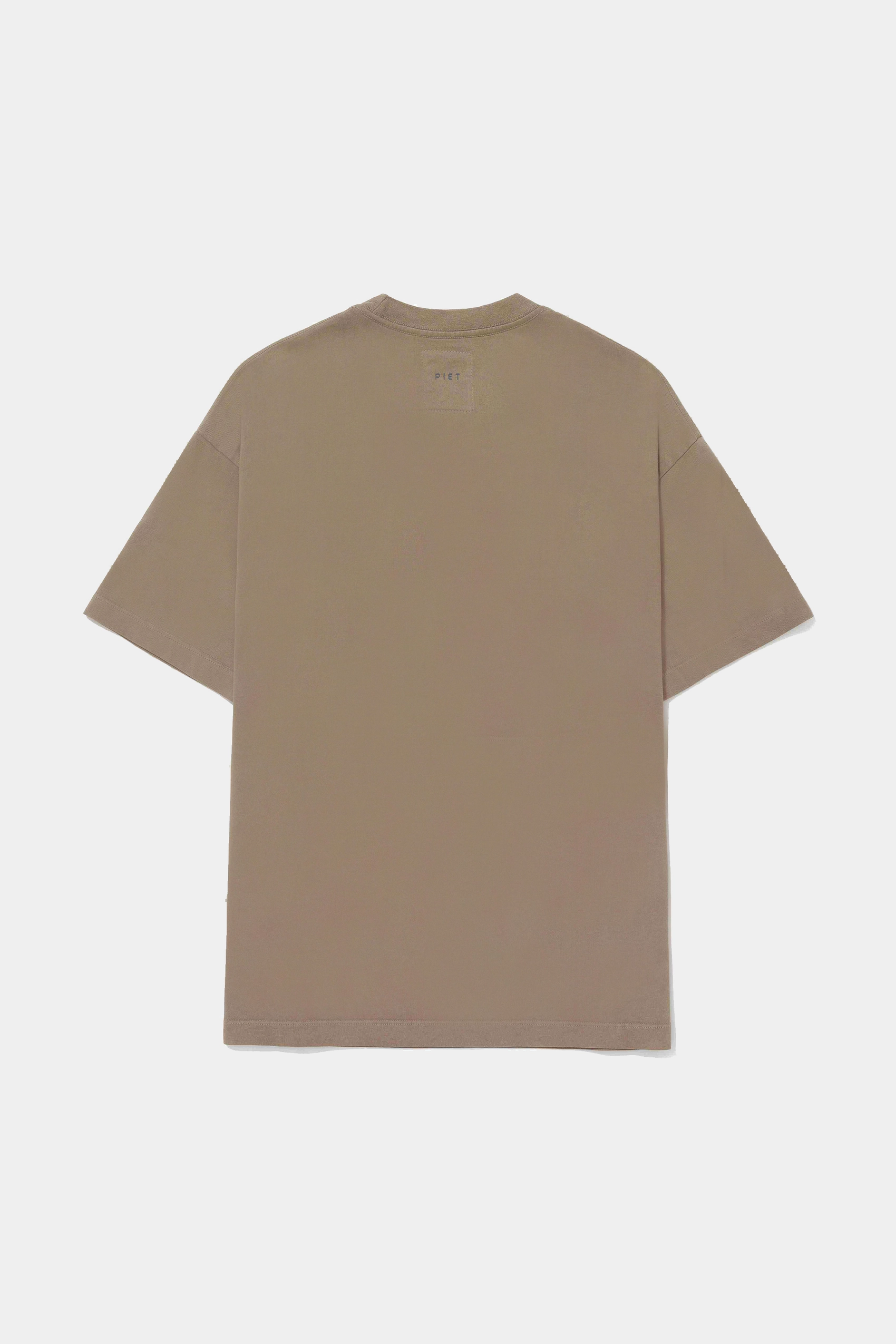 A modelagem relaxed traz ombros caídos e gola de 2,5 cm, reforçando a silhueta contemporânea da PIET. Na parte frontal, a pequena elipse com acabamento levemente metálico adiciona um toque sutil de futurismo, enquanto o logo PIET próximo à gola traseira completa a assinatura da collab.