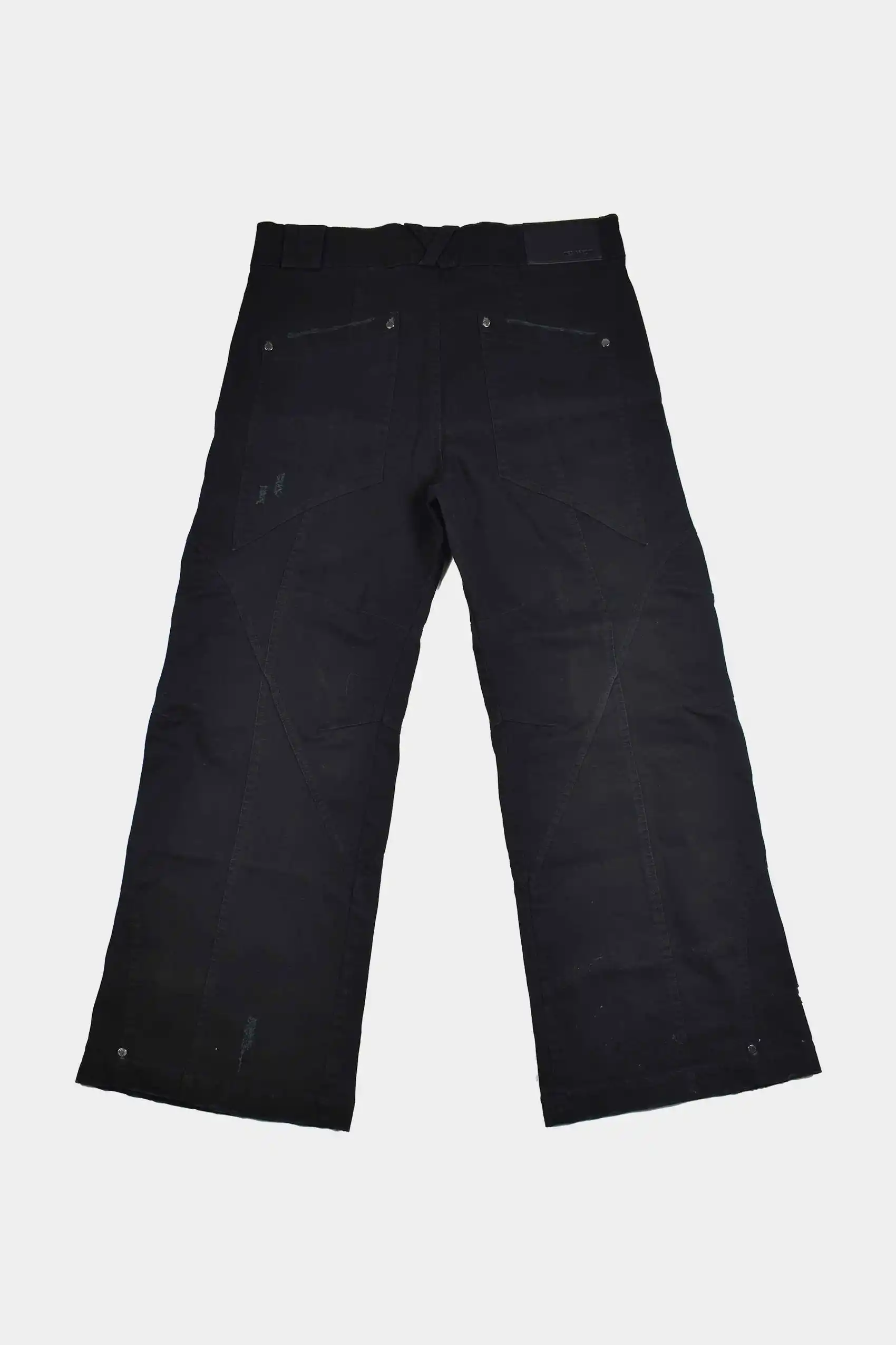 Com modelagem wide e construção em sarja, a calça mistura referências de alfaiataria com elementos utilitários e industriais. O cós estruturado contrasta com os detalhes brutos, como rebites, recortes e o bolso traseiro assimétrico, criando uma estética imperfeita e intencional.